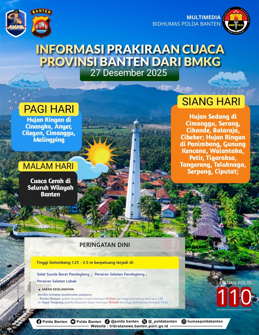 JENDELANUSANTARA.COM, Serang – Menyikapi prakiraan cuaca dari Badan Meteorologi, Klimatologi, dan Geofisika (BMKG) Banten, Polda Banten mengimbau masyarakat untuk meningkatkan kewaspadaan terhadap potensi cuaca ekstrem yang dapat terjadi di sejumlah wilayah Provinsi Banten pada Sabtu (27/12).