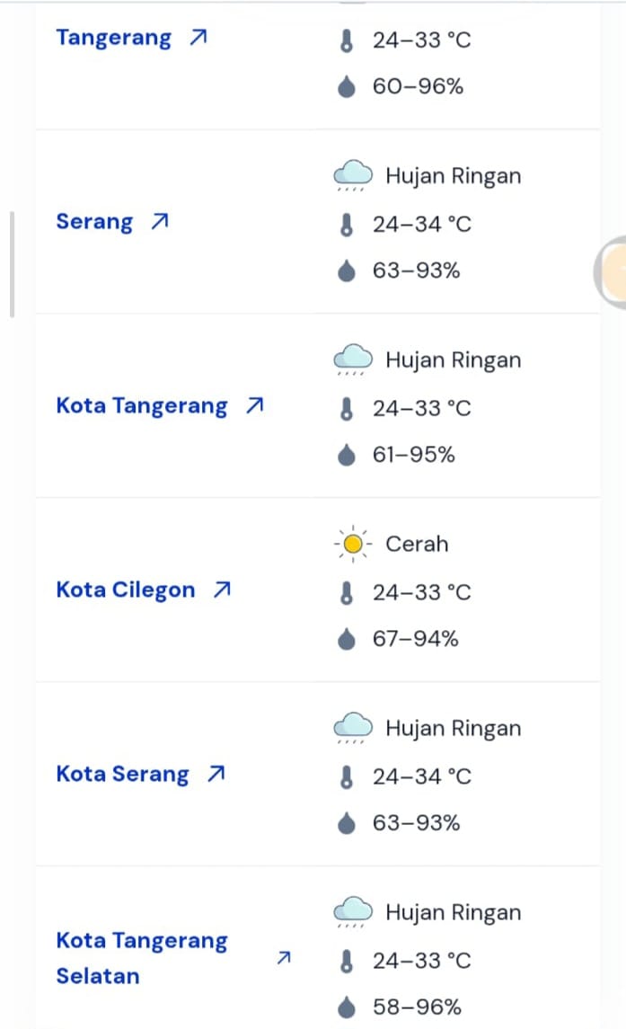 Lebih lanjut, Meryadi menyampaikan bahwa memasuki siang hari Siang hari akan Berawan; Hujan Sedang di Cibeber, Lebakgedong; Hujan Ringan di Panggarangan, Muncang, Bojongmanik, Cimarga, Sajira, Curug Bitung, Cirinten, Cimanggu, Cibaliung, Cikeusik, Panimbang, Munjul, Sindangresmi, Serang, Kramatwatu, Waringinkurung, Ciruas, Baros, Padarincang, Mancak, Tigaraksa, Curug, Cisauk, Tangerang, Batu Ceper, Serpong, Ciputat dan malam hari berawan; Hujan Ringan di Curug, Cisauk, Ciledug, Serpong, Ciputat.