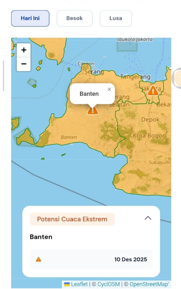 JENDELANUSANTARA.COM, Serang – Berdasarkan pembaruan informasi dari Badan Meteorologi Klimatologi dan Geofisika (BMKG) pada Rabu (10/12), pukul 06.00 WIB, Polda Banten kembali mengimbau masyarakat untuk meningkatkan kewaspadaan terhadap potensi cuaca ekstrem yang masih berpotensi terjadi di sejumlah wilayah Provinsi Banten. Selain itu, masyarakat juga diminta memperhatikan laporan aktivitas vulkanik Anak Krakatau yang saat ini berada di Level II (Waspada).