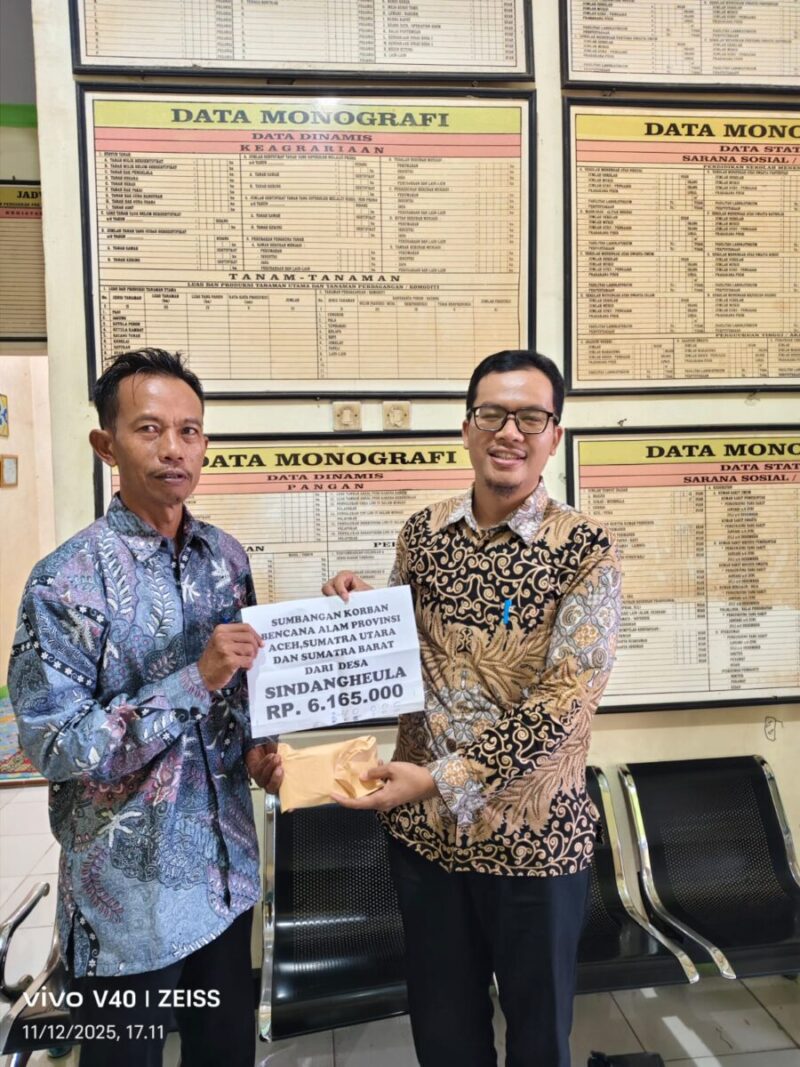 JENDELANUSANTARA.COM, Sindangheula – Pemerintah Desa Sindangheula, Kecamatan Pabuaran, resmi menyalurkan donasi kemanusiaan untuk korban bencana banjir bandang yang terjadi di Provinsi Aceh, Sumatra Barat, dan Sumatra Utara. Penyaluran dilakukan pada Kamis, 11 Desember 2025, oleh Kepala Desa Sindangheula Suheli, S.Kom.I., MM, dan diterima langsung oleh Kasi Ekbang Kecamatan Pabuaran, Khairudin, untuk kemudian dihimpun di tingkat Kabupaten Serang sebelum disalurkan ke wilayah terdampak.