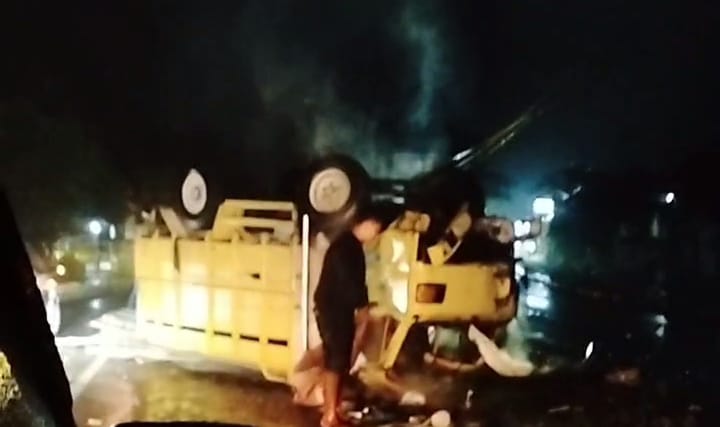 ‎Benturan keras membuat truk langsung oleng, terguling ke kiri, dan kemudian terbalik di badan jalan.