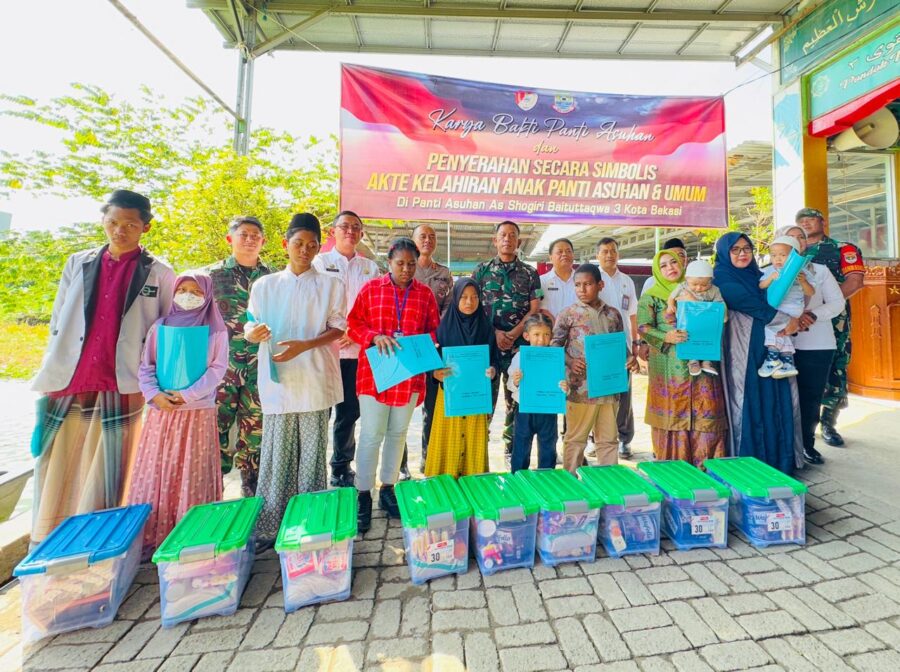 JENDELANUSANTARA.COM, KotaBekasi – Penerbitan Akta Kelahiran dalam rangka Karya Bhakti Korem 051/WKT bekerja sama dengan Disdukcapil Kota Bekasi untuk anak-anak Panti Asuhan dan Umum dilaksanakan selama dua hari pada tanggal 22 April 2025 di Kantor Kodim 0507/Bekasi dan tanggal 23 April 2025 di Pesantren As Shogiri.