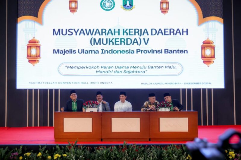JENDELANUSANTARA.COM, Kota Serang – Wakil Gubernur Banten Achmad Dimyati Natakusumah menegaskan pentingnya peran ulama dan kiai dalam pembangunan Sumber Daya Manusia (SDM) yang unggul, berdaya saing, dan berakhlak mulia di Provinsi Banten. Penegasan ini disampaikan saat memberikan arahan pada Musyawarah Kerja Daerah (Mukerda) ke-V Majelis Ulama Indonesia (MUI) Provinsi Banten di Ballroom Universitas Serang Raya (Unsera), Kota Serang, Rabu (10/12/2025).