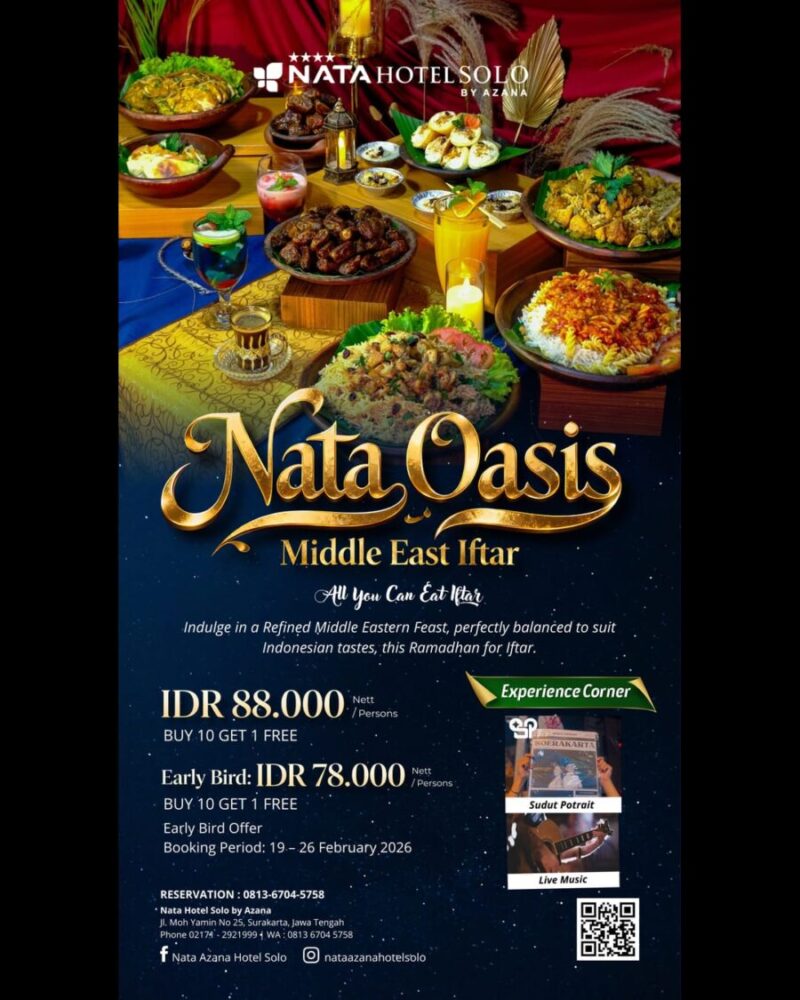 Untuk informasi dan reservasi, masyarakat dapat menghubungi RSVP 0813-6704-5758, atau mengunjungi Nata Hotel Solo by Azana di Jl. Moh Yamin No. 25, Surakarta, Jawa Tengah. Informasi lebih lanjut juga tersedia melalui akun Instagram @nataazanahotelsolo dan TikTok @nataazanahotelsoc. (Aga)