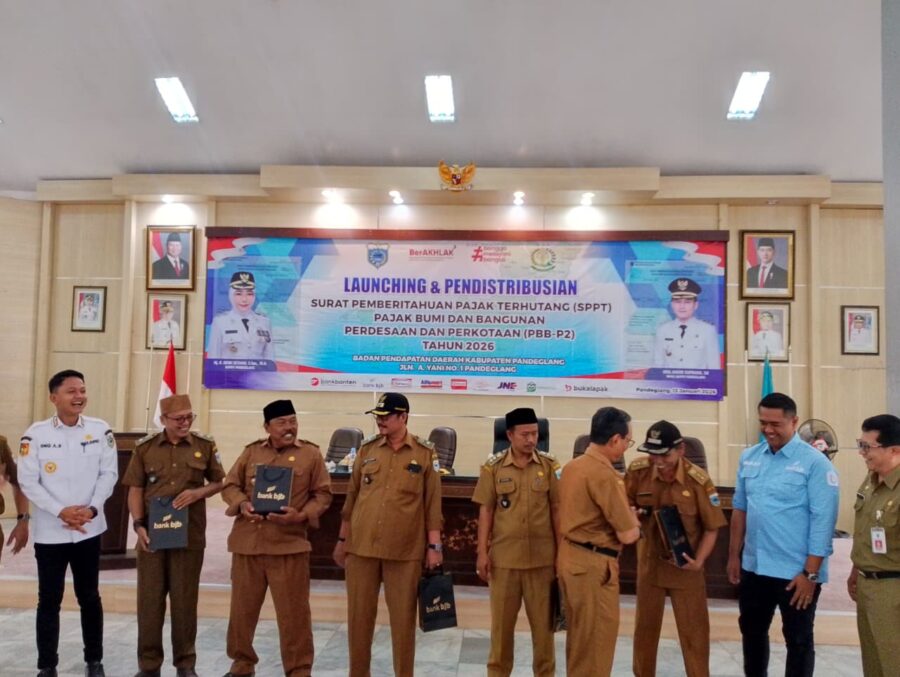 JENDELANUSANTARA.COM, Pandeglang – Wakil Bupati (Wabup) Pandeglang Iing Andri Supriadi, didampingi Sekretaris Daerah (Sekda) Kabupaten Pandeglang Asep Rahmat, menghadiri kegiatan Launching dan Distribusi Surat Pemberitahuan Pajak Terhutang (SPPT) Pajak Bumi dan Bangunan Perdesaan dan Perkotaan (PBB-P2) Kabupaten Pandeglang Tahun 2026, di Gedung Pendopo Kabupaten Pandeglang, Selasa (13/1/2026).