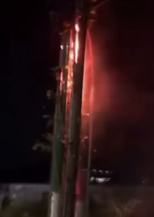 Dalam video yang beredar, terlihat kobaran api cukup besar menjalar di sepanjang tiang listrik.