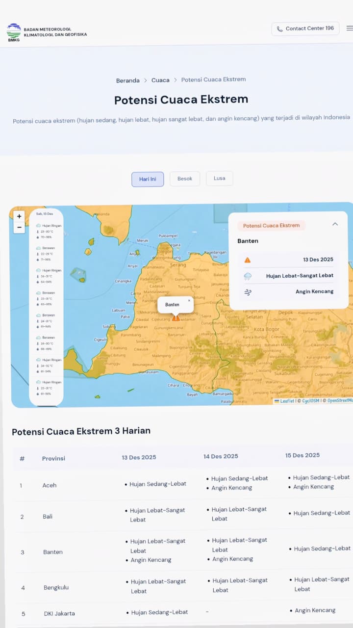 JENDELANUSANTARA.COM, Serang – Polda Banten mengimbau masyarakat untuk meningkatkan kewaspadaan terhadap potensi cuaca ekstrem di sejumlah wilayah Provinsi Banten berdasarkan prakiraan cuaca Badan Meteorologi, Klimatologi, dan Geofisika (BMKG) Banten hari ini, Sabtu (13/12).