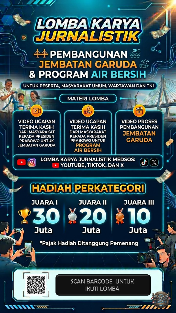 Adapun karya jurnalistik yang diharapkan meliputi berbagai tema strategis, mulai dari ucapan terima kasih masyarakat kepada Presiden Prabowo Subianto atas pembangunan Jembatan Garuda hingga program air bersih.