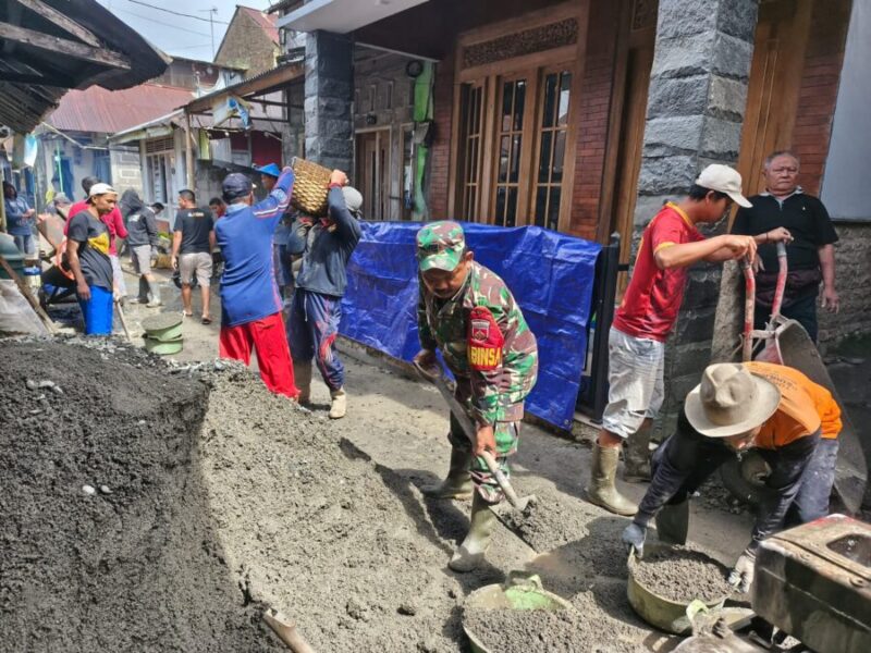 JENDELANUSANTARA.COM, Wonosobo – Puluhan anggota Koramil 01/Wonosobo bersama warga Kalianget kompak melaksanakan gotong royong pengecoran jalan lingkungan di RT 06 RW 02, Kecamatan Wonosobo, Selasa (18/11/2025).