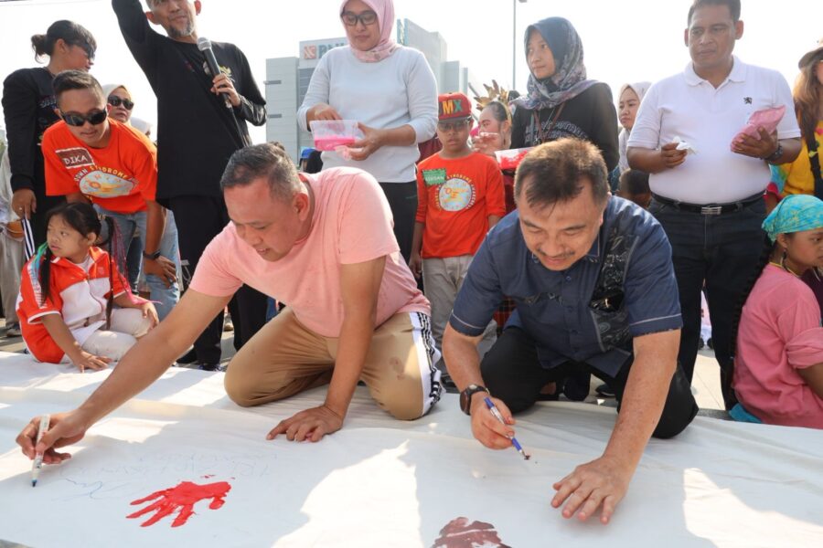 Sebagai bentuk kepeduliannya, Wali Kota bersama Wakil Wali Kota Bekasi serta Plt. Kepala Dinas PPPA memberikan simbol pada kain putih berupa cap tangan dan tanda tangan diikuti oleh hadirin.
